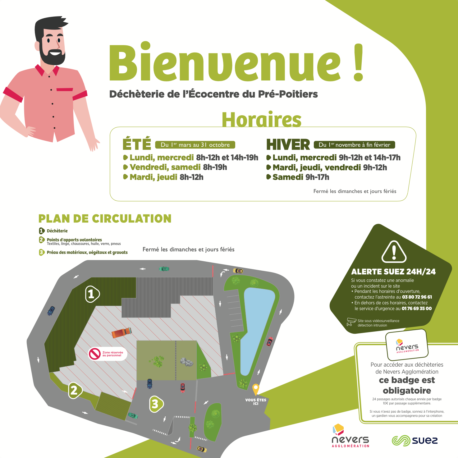 Ouverture d'un nouvel Ecocentre à Nevers : Pré Poitiers réouvre ses portesA partir du mardi 2 septembre, la déchèterie des Taupières sera définitivement fermée pour laisser place à une nouvelle expérience de déchèterie plus simple, plus rapide et plus durable. Vous pourrez dorénavant déposer vos déchets dans le nouvel Écocentre du Pré Poitiers à l’Est de Nevers, et bien sûr toujours à l’Écocentre des Grands Prés, à l’Ouest de Nevers. Ecocentre du Pré Poitiers Horaires d'été (du 1er mars au 30 octobre) : Lundi et mercredi : 8h-12h / 14h-19h Mardi et Jeudi : 8h-12h Vendredi et samedi : 8h-19h Horaires d'hiver (du 1er novembre au 28 février): Lundi et mercredi : 9h-12h / 14h-17h Mardi, jeudi et vendredi : 9h-12h Samedi : 9h-17h