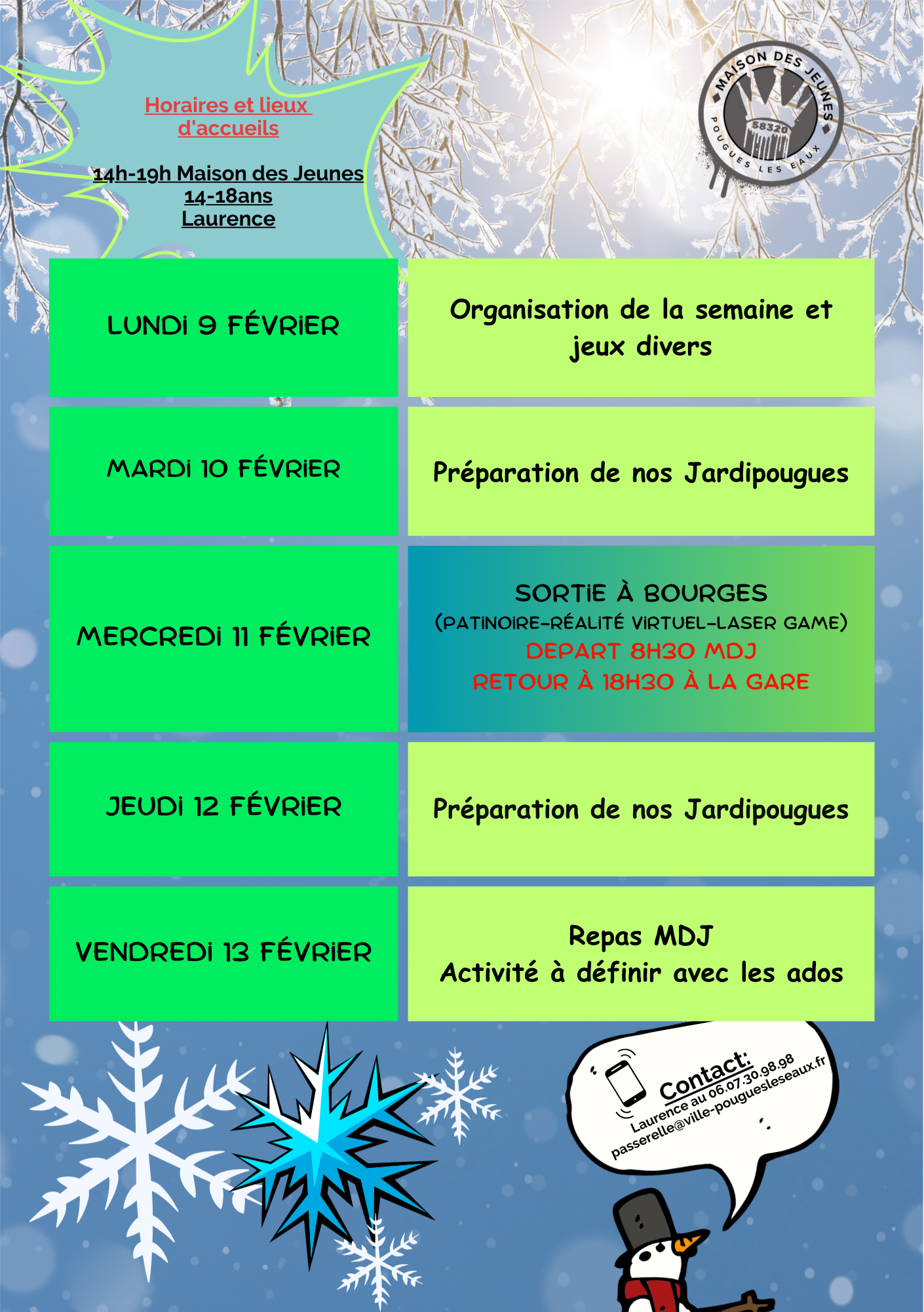 Une MDJ, ça sert à quoi ?Le dialogue avec des jeunes de son âge fait partie des besoins de l’adolescent. La Maison Des Jeunes est un vecteur de communication à leur épanouissement personnel. Ils peuvent s’y retrouver pour parler de leurs passions et parfois en trouver pour ceux qui n’en ont pas par le biais de la discussion. La Maison Des Jeunes à également pour objectif de combattre la passivité et l’ennui de l’adolescent de « zonage » grâce à des activités ponctuelles (sorties, soirées,…) mais aussi des activités à long terme (projet de vacances d’hiver, d’été, projet divers sur des thématiques qui les intéresse,…) La MDJ accueille des jeunes de 14 à 18 ans. C’est un lieu où ils arrivent et partent quand ils le désirent. Cet espace jeunes comprend :