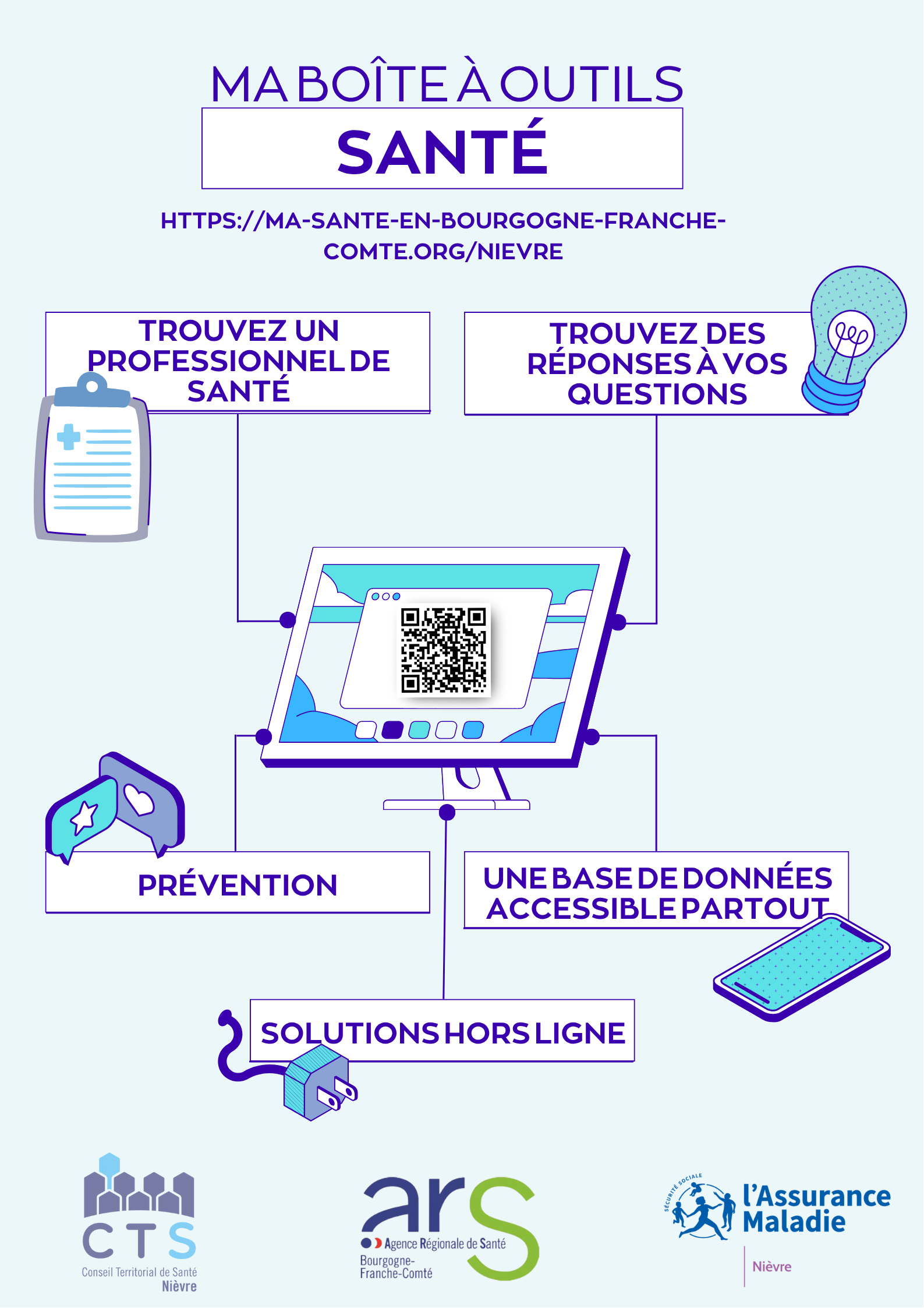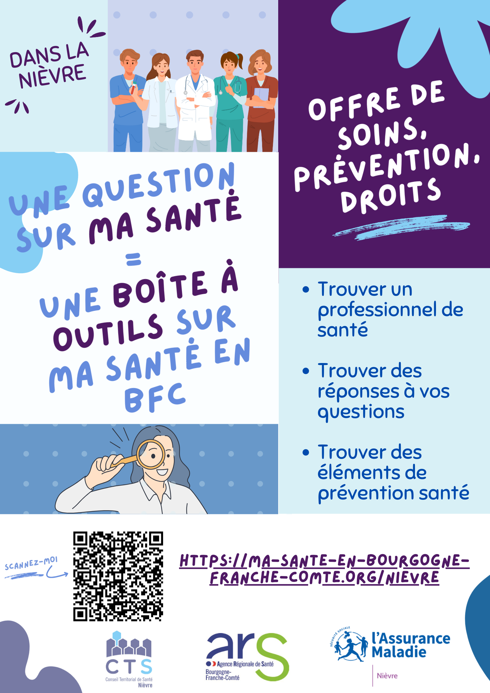 Répertoire de Santé Nièvre Afin de répondre aux difficultés d'accès aux soins, les membres du CTS 58 (Conseil Territorial de Santé) ont souhaité élaborer un répertoire recensant les ressources disponibles sur le territoire. Ce répertoire, non exhaustif, a pour ambition de faciliter l'accès aux informations de santé pour les usagers du département. Plutôt que de créer un nouvel annuaire, les membres du CTS 58 ont choisi de compiler et centraliser les données existantes afin d'offrir une vue d'ensemble des services disponibles. Pour faciliter la recherche, les informations sont organisées en trois rubriques principales :